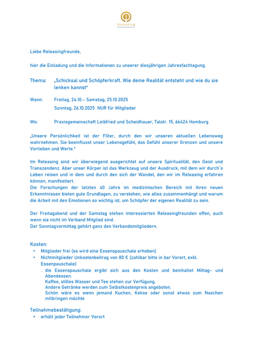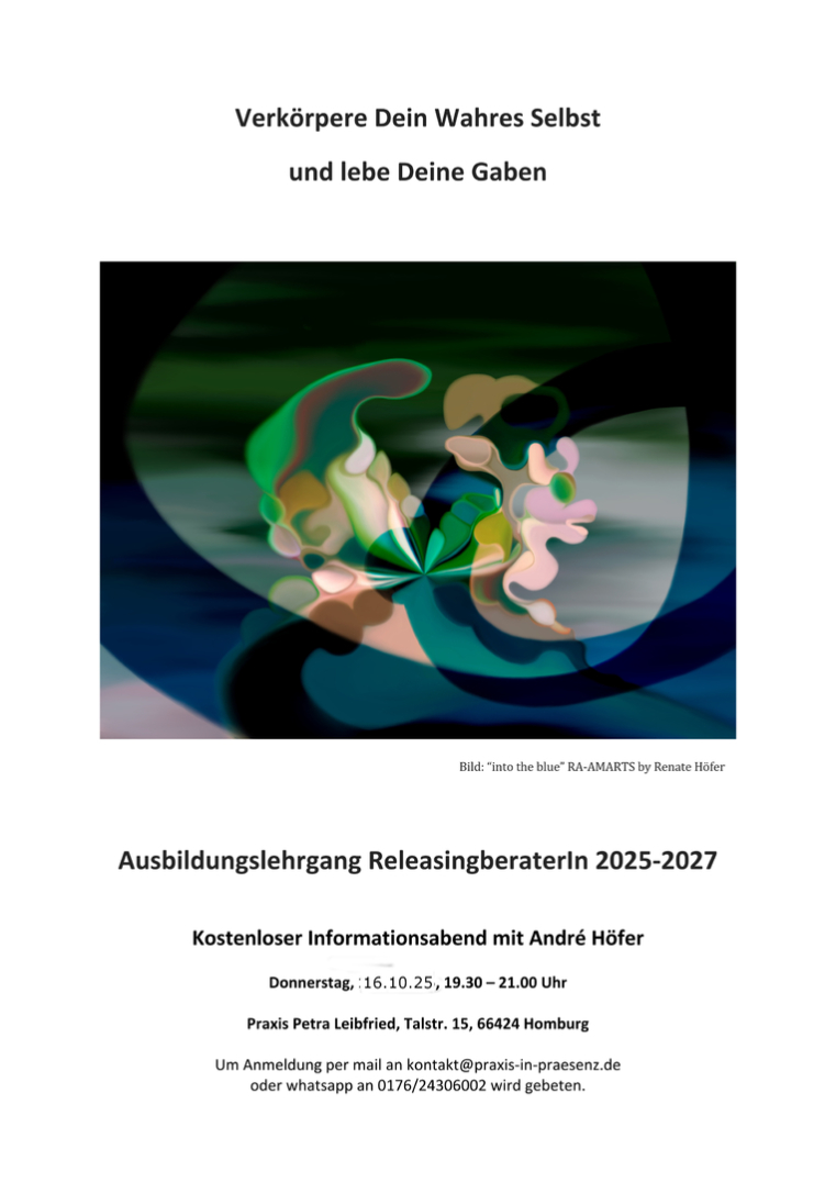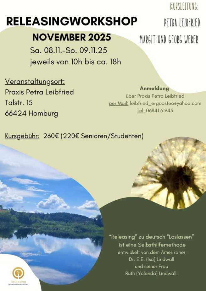 Das Seminar ist sowohl für Releasingerfahrene als auch einfach nur für Menschen, die sich nach einem befreiten Leben sehnen. Herzlich willkommen!