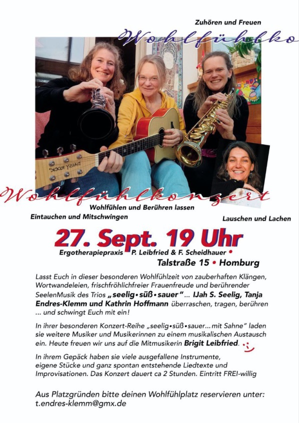 Wohnzimmerkonzert mit dem Trio "seelig • süß • sauer" und der Gastmusikerin Birgit Leibfried am 27.09.25 in der Ergopraxis P.Leibfried & F. Scheidhauer, Talstraße 15, Homburg.